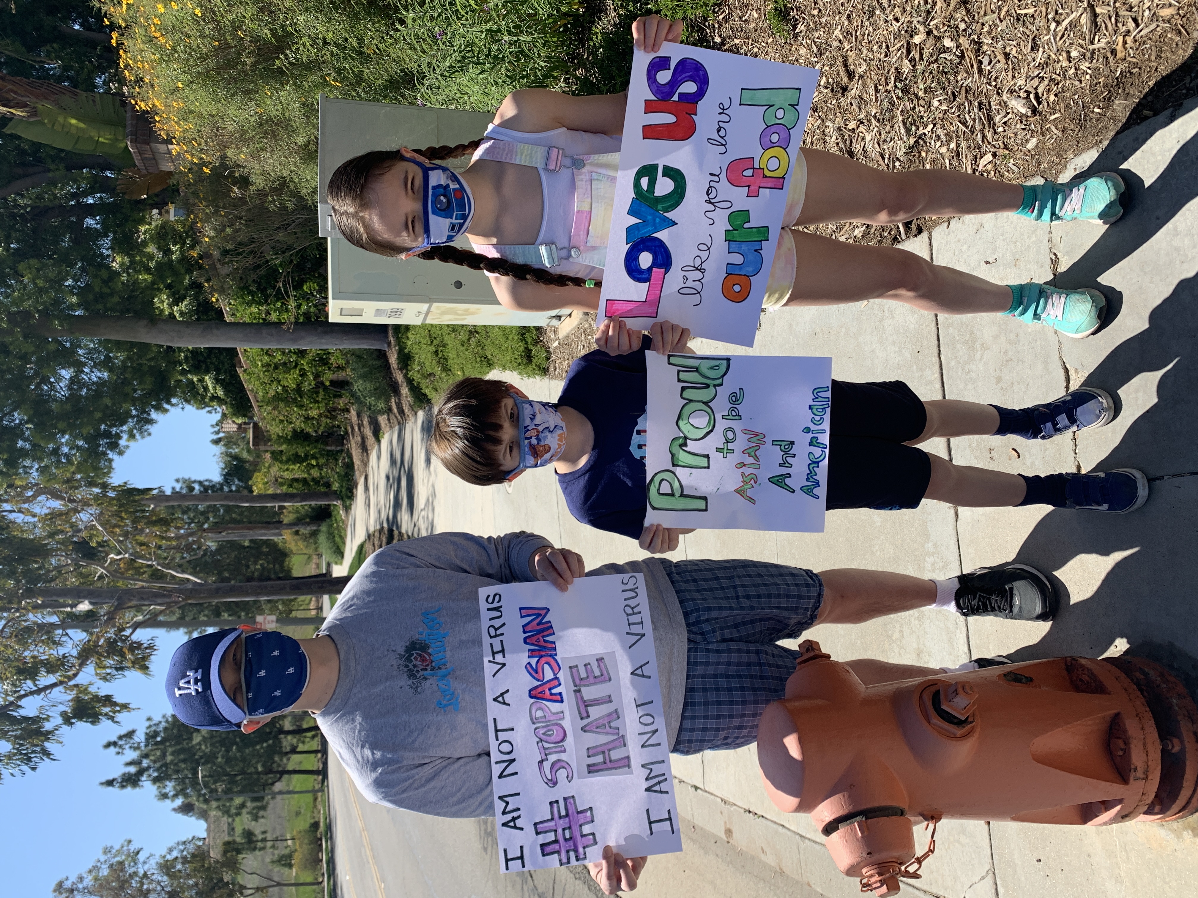 The rise in Asian hate crimes has gone hand in hand with COVID. This certainly was not helped by the previous administration continually referring to COVID as “China Flu” or “Kung Flu.” One of the more horrifying things is how close to home these incidents are happening. Just this month, there were two attacks at a local park on Asian Americans. One was on a Japanese-American Olympian, who was in training. The other was on an elderly Korean-American couple. I live in Southern CA, which has the third highest proportion of the population identifying as Asian, yet even here, racism and racially motivated violent crimes are happening. If there is any positive that is coming out of this, it is the honest conversations we’re having with our children about race. In light of George Floyd and similar situations, the immigrant population at the border, and anti-Asian crimes, our kids are engaged in an active dialogue about equity, prejudice, racism and our response to it. My children are proud to be Asian-American and seeing that pride and them use their voices, even in a small way, makes me hopeful for positive change. Like their signs say, they are proud to be Asian AND American, and to love them like people love Asian food! Oh yeah, and in this pandemic year, a reminder that they are not a virus.