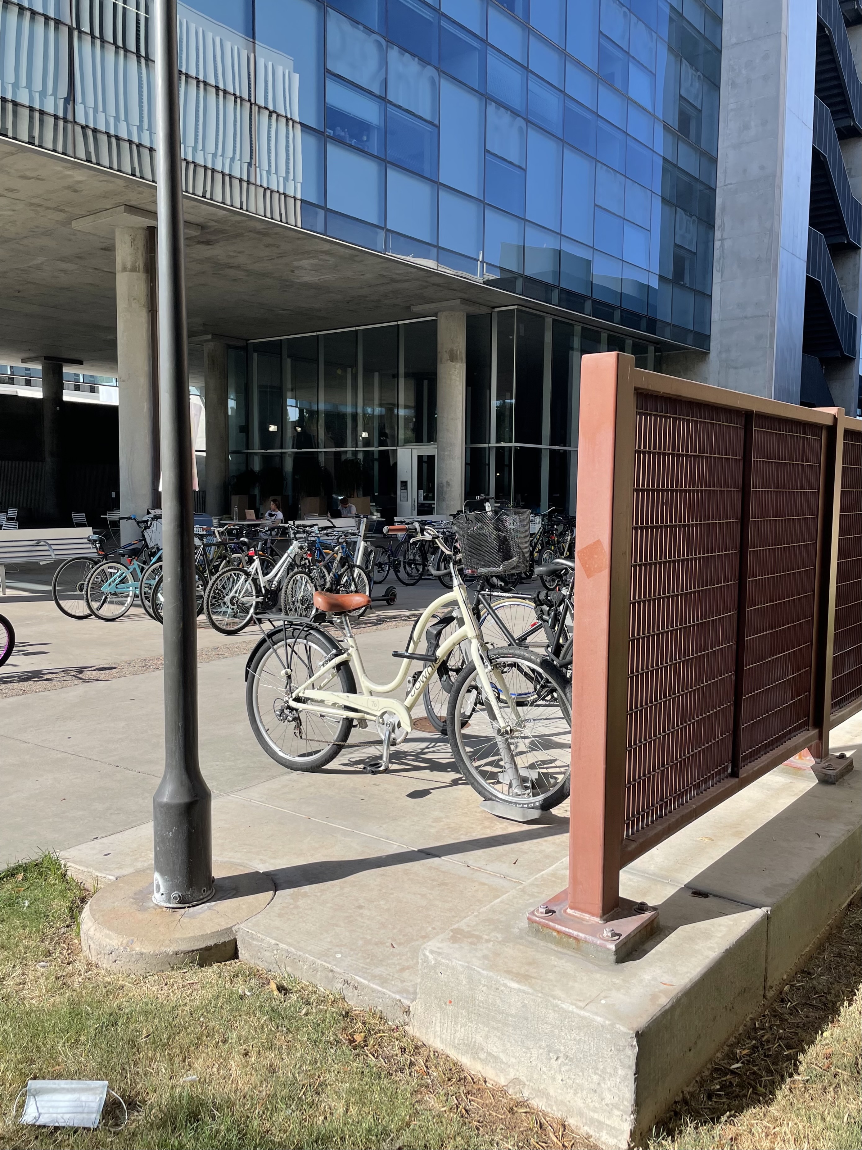 A disposable mask was discarded/lost by the bike rack near the COOR building on campus.