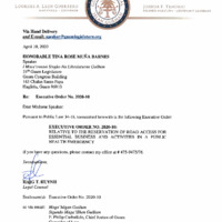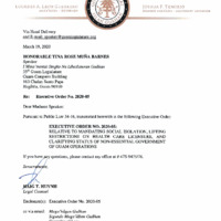 Ranging in date from March 16 to April 10, 2020, these executive orders proclaimed by the Governor of Guam detail that island's reaction to COVID-19's appearance there. These documents cover topics such as road accessibility for essential businesses and public health emergency operations, social distancing/isolation and clarifications of what is an essential and non-essential business, as well as telehealth expansion, and eviction/price gouging prohibitions during the public health emergency.