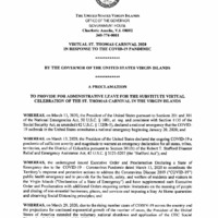 These executive orders from the US Virgin Islands reflect the various changes wrought by COVID-19, not to mention the virus's stubborn presence, thus requiring extensions of earlier orders. Found in this set of directives dating from April and May 2020 are mandates for beach closures, extension of the V.I. safer-at-home order, and information pertaining to the virtual presentation of the annual St. Thomas Carnival.