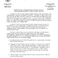 Issued at the end of April 2020, these public health directives include guidance on staff-to-patient ratios in dialysis units, COVID-19 data accessibility, allowing certain referrals to labs conducting COVID-19 testing, and essential practices for the continued operation of farmers' markets in Massachusetts. While most of these orders highlight the virus's testing and healthcare impacts, the last ordnance reflects the careful mitigation efforts employed to ensure access to a healthy food supply.