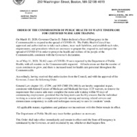 These two orders, issued by the Massachusetts Public Health Commissioner in late April and early May of 2020, waive the time frame for CNA training and the need for health screenings in Massachusetts schools. Both of these mandates reflected the constant need to buttress the number of frontline medical personnel available for service, as well as the fact that Massachusetts schools would no longer require such screenings due to the transition to virtual learning.