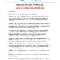 After the city of Wichita decreed compulsory mask-wearing, the Sedgwick County Local Health officer issued an emergency order overriding the County Commission's decision to not make masks in public mandatory. The first order states that no penalties will enforce the mandate's provisions, while the second, issued the very next day, adds religious institutions to the list of exempted parties; a hot button issue that saw Governor Laura Kelly's administration besieged by lawsuits and accusations of abuse of power during the statewide lockdown. Therefore, these texts are products of the political tensions that hobbled Kansas's response efforts in the face of a surging COVID-19 crisis, with state and local leaders, most if not all of whom identified as Republicans, opting for non-existent counter-measures that prevented "executive overreach," but allowed the virus to flourish.