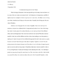 This essay was produced as a part of the American Studies program at California High School in San Ramon, California. The essay is in response to the prompt "Is America currently living up to its core values?" This essay argues America has not lived up to the core value of equality that it promised, yet alleges that it has maintained its promise of freedom. It also includes references to the following modern events: the blm movement and the freedom of protest