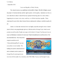 This essay was produced as a part of the American Studies program at California High School in San Ramon, California. The essay is in response to the prompt "Is America currently living up to its core values?" This essay argues that justice is a value that is being upheld but equality is still being fought for. It also includes references to the following modern events: Incarceration rates, the death of George Floyd