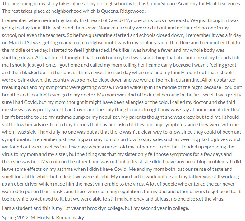 This item was submitted on February 27, 2022 by Javier Arias using the form “Share Your Story With Us” on the site “Brooklyn College New York”: https://www.covid-19archive.org/s/brooklyncollege