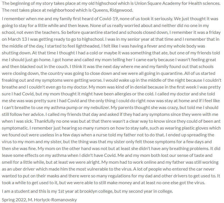 This item was submitted on February 27, 2022 by Javier Arias using the form “Share Your Story With Us” on the site “Brooklyn College New York”: https://covid-19archive.org/s/brooklyncollege