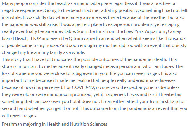 This item was submitted on February 28, 2022 by [anonymous user] using the form “Share Your Story With Us” on the site “Brooklyn College New York”: https://covid-19archive.org/s/brooklyncollege