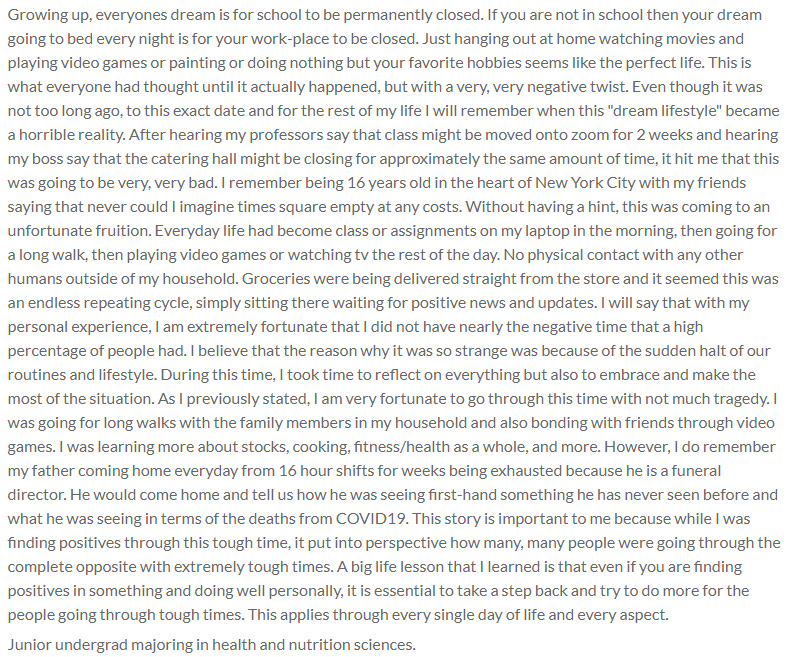 This item was submitted on March 1, 2022 by [anonymous user] using the form “Share Your Story With Us” on the site “Brooklyn College New York”: https://www.covid-19archive.org/s/brooklyncollege