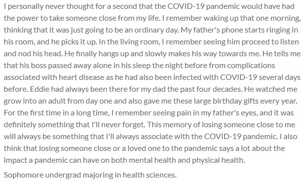 This item was submitted on March 2, 2022 by [anonymous user] using the form “Share Your Story With Us” on the site “Brooklyn College New York”: https://covid-19archive.org/s/brooklyncollege
