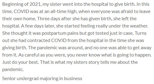 This item was submitted on March 2, 2022 by [anonymous user] using the form “Share Your Story With Us” on the site “Brooklyn College New York”: https://www.covid-19archive.org/s/brooklyncollege