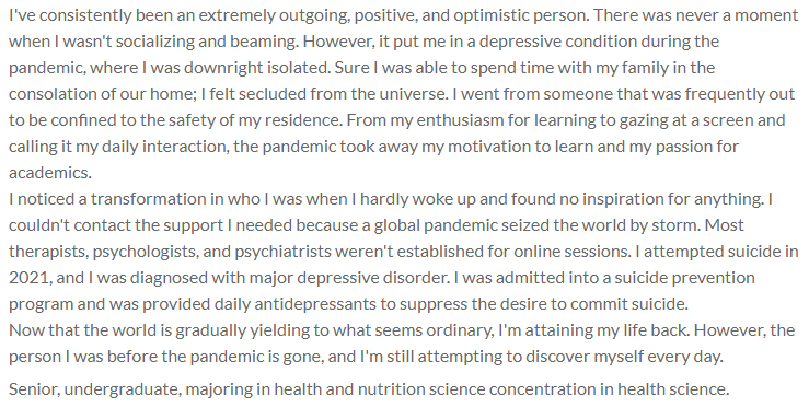 This item was submitted on March 2, 2022 by [anonymous user] using the form “Share Your Story With Us” on the site “Brooklyn College New York”: https://covid-19archive.org/s/brooklyncollege