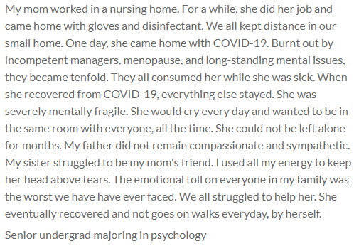 This item was submitted on March 2, 2022 by [anonymous user] using the form “Share Your Story With Us” on the site “Brooklyn College New York”: https://www.covid-19archive.org/s/brooklyncollege