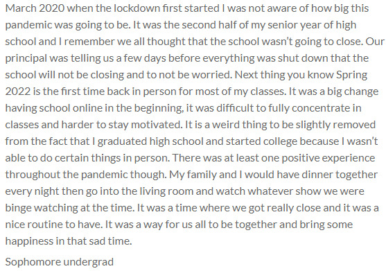 This item was submitted on March 2, 2022 by [anonymous user] using the form “Share Your Story With Us” on the site “Brooklyn College New York”: https://www.covid-19archive.org/s/brooklyncollege