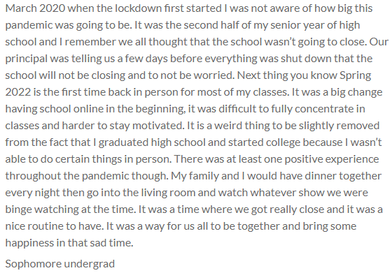 This item was submitted on March 2, 2022 by [anonymous user] using the form “Share Your Story With Us” on the site “Brooklyn College New York”: https://covid-19archive.org/s/brooklyncollege