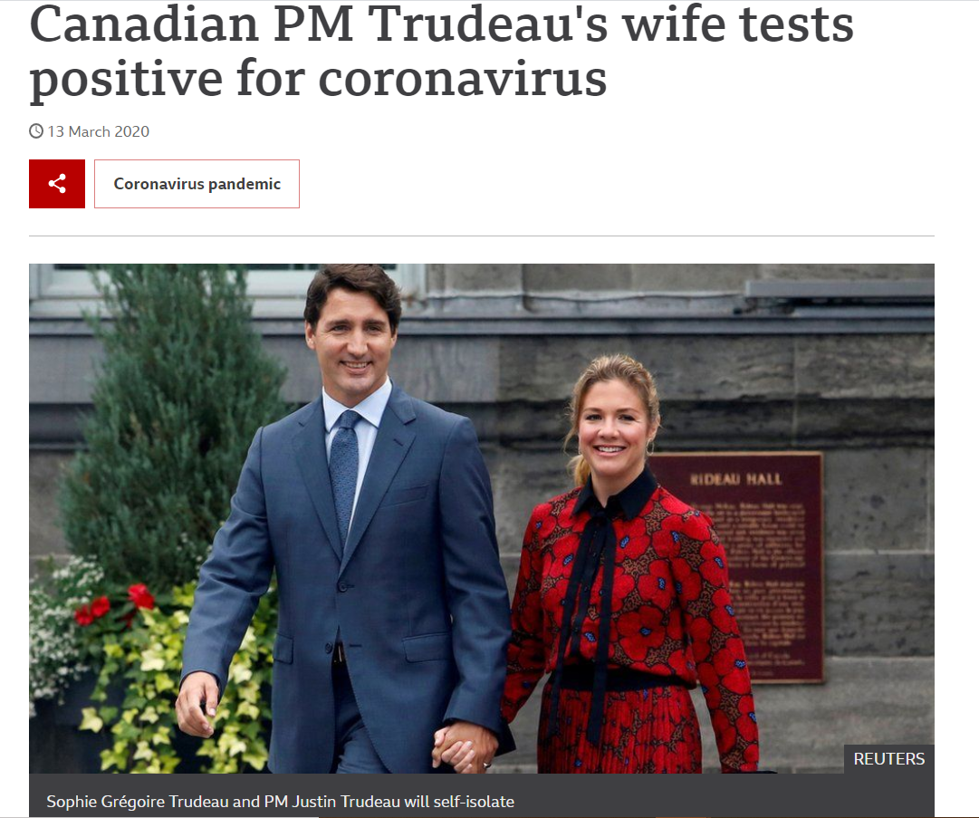 Canadian PM Trudeau's wife tests positive for coronavirus
