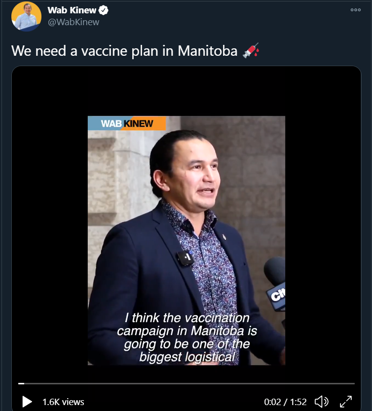 Twitter video of Wab Kniew calling on the Manitoba Government to create a vaccine plan for Manitoba