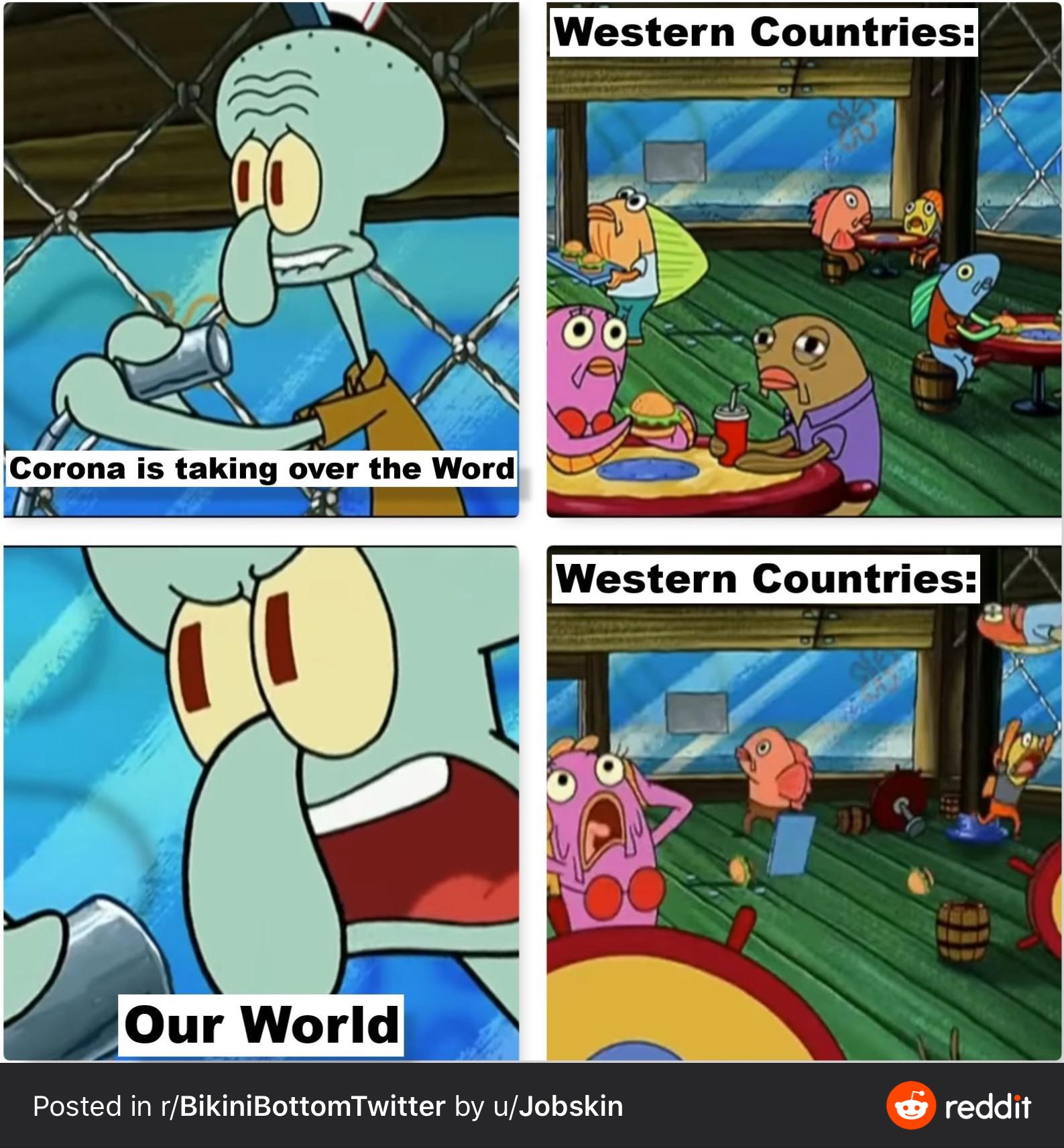 Meme mocks response from Western countries to Covid-19 outbreak.