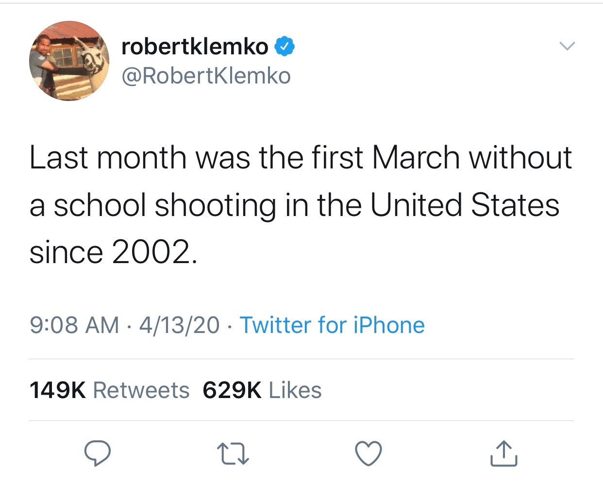 Viral Tweet demonstrates unintended benefits of COVID-19 pandemic. March of 2020 was the first March without a school shooting in the US since 2002.