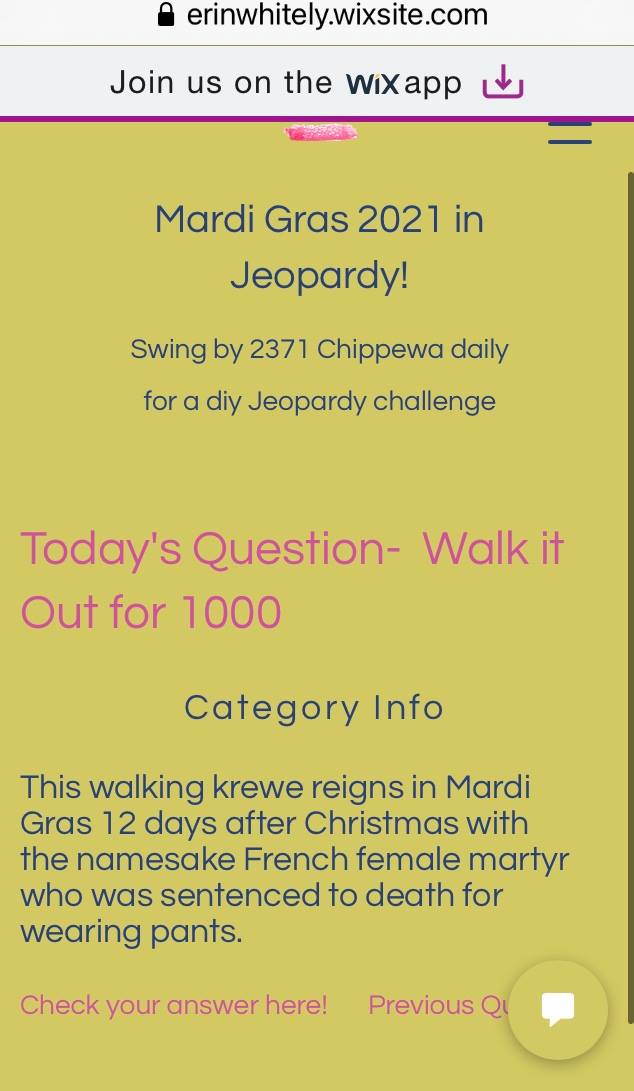 With Carnival parades cancelled, somebody had the bright idea to start the Krewe of House Floats to (a) make up for it and (b) to offer work to unemployed float artisans. The results have gone beyond everyone's wildest imagination with 5,000+ people signing up in New Orleans, surrounding parishes, and around the world. Erin Whitely & Aaron Whitely's interactive “Jeopardy” House Float on Chippewa Street was one of the most memorable and creative. Here's also that day's "Answer" that came up on your cell phone when you scanned the QR Code.