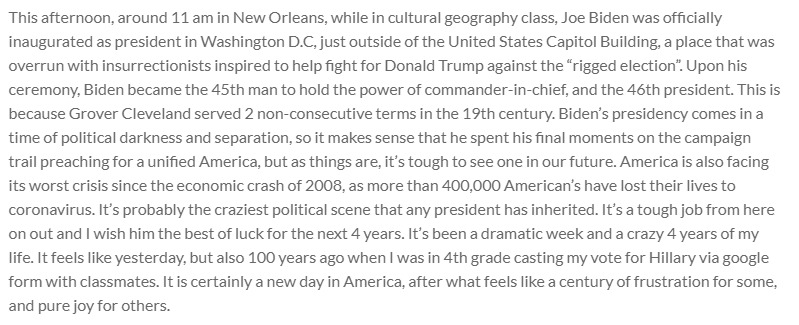 This afternoon, around 11 am in New Orleans, while in cultural geography class, Joe Biden was officially inaugurated as president in Washington D.C, just outside of the United States Capitol Building, a place that was overrun with insurrectionists inspired to help fight for Donald Trump against the “rigged election”. Upon his ceremony, Biden became the 45th man to hold the power of commander-in-chief, and the 46th president. This is because Grover Cleveland served 2 non-consecutive terms in the 19th century. Biden’s presidency comes in a time of political darkness and separation, so it makes sense that he spent his final moments on the campaign trail preaching for a unified America, but as things are, it’s tough to see one in our future. America is also facing its worst crisis since the economic crash of 2008, as more than 400,000 American’s have lost their lives to coronavirus. It’s probably the craziest political scene that any president has inherited. It’s a tough job from here on out and I wish him the best of luck for the next 4 years. It’s been a dramatic week and a crazy 4 years of my life. It feels like yesterday, but also 100 years ago when I was in 4th grade casting my vote for Hillary via google form with classmates. It is certainly a new day in America, after what feels like a century of frustration for some, and pure joy for others.