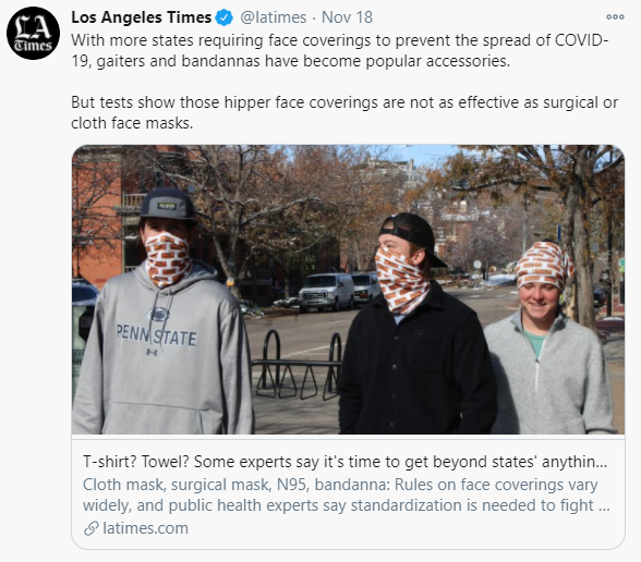 With more states requiring face coverings to prevent the spread of COVID-19, gaiters and bandannas have become popular accessories. But tests show those hipper face coverings are not as effective as surgical or cloth face masks.