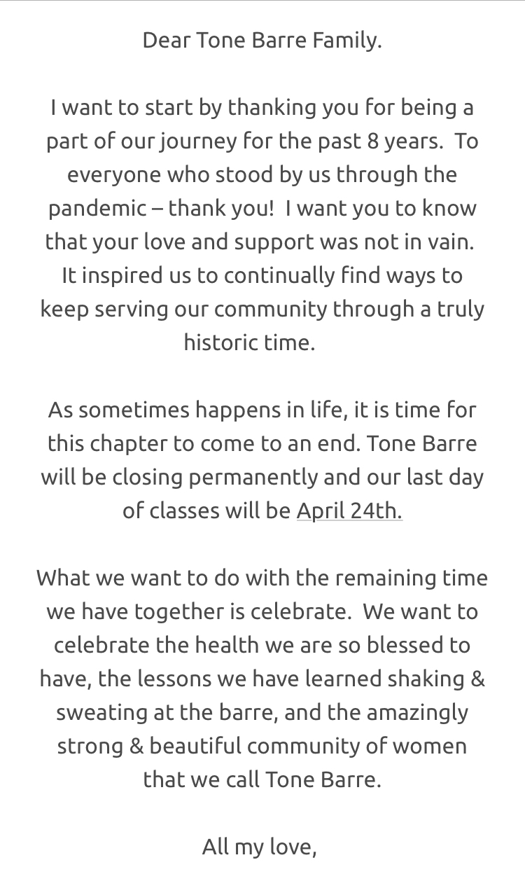 especially before I returned to work in person. Up until a few weeks ago, my most consistent live interaction with adult humans not living in this house were my barre instructors and the other women in the classes. So when I opened my email and saw this message, it hit me like a ton of bricks. They couldn’t survive COVID-19. It makes sense - they had two studios before COVID and rent is not cheap in Orange County. I am, of course selfishly sad - where will I find a reasonably priced, low impact but high intensity exercise studio that is five minutes from both my daughter’s gym and our church? But my real sadness is for the small business owner who opened this studio eight years ago. She is truly passionate about physical and mental health and is probably one of the most positive people I have ever met. And in a way that doesn’t annoy you, which honestly is a gift. As people get excited about businesses reopening, it makes me reflect on how many more have had to close their doors permanently.