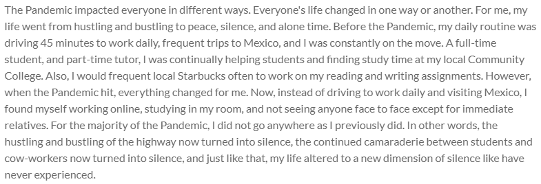 The Pandemic impacted everyone in different ways. Everyone's life changed in one way or another. For me, my life went from hustling and bustling to peace, silence, and alone time. Before the Pandemic, my daily routine was driving 45 minutes to work daily, frequent trips to Mexico, and I was constantly on the move. A full-time student, and part-time tutor, I was continually helping students and finding study time at my local Community College. Also, I would frequent local Starbucks often to work on my reading and writing assignments. However, when the Pandemic hit, everything changed for me. Now, instead of driving to work daily and visiting Mexico, I found myself working online, studying in my room, and not seeing anyone face to face except for immediate relatives. For the majority of the Pandemic, I did not go anywhere as I previously did. In other words, the hustling and bustling of the highway now turned into silence, the continued camaraderie between students and cow-workers now turned into silence, and just like that, my life altered to a new dimension of silence like have never experienced.