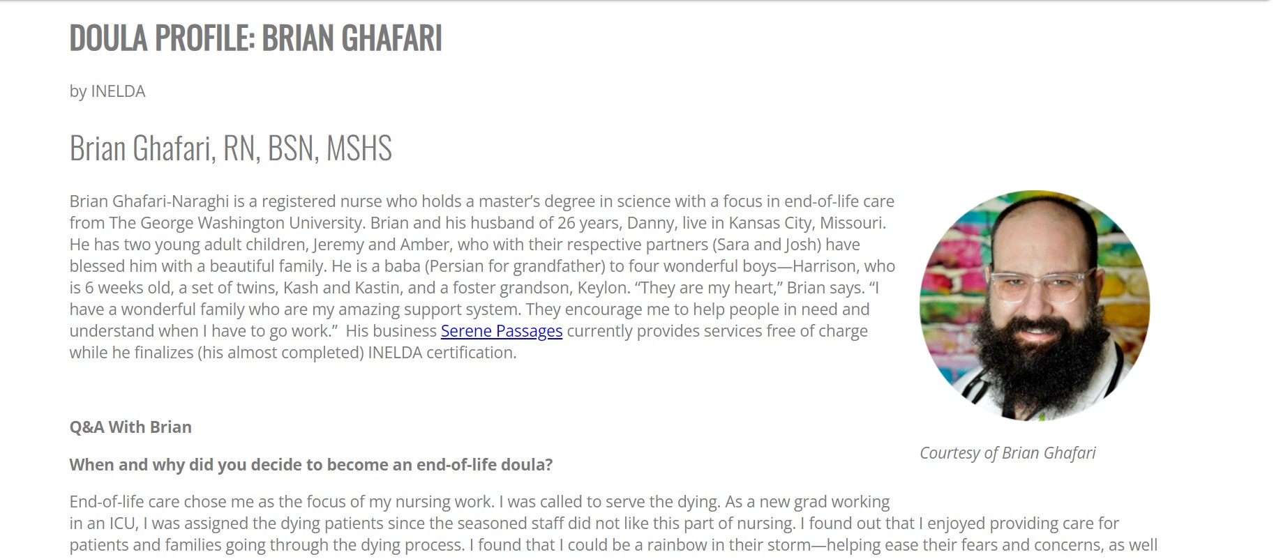 You know sometimes you have to care for the spouse dying, or of the dying, too. I had a lady that I had to teach how to balance a checkbook. Because her husband did the bills all their lives. She had never written a check. So I started teaching her and, we got a volunteer to, there was an accountant that was showing her how to do do that. And that, to me, the family is the unit of care. And family is who's the patient says, his family. We're born with family, and we collect family along the way. And sometimes the family we collect are more important than the ones that are related to us by blood. And, you know, because I want people to be surrounded by love, at the end of the day. They were loved. No matter. My grandmother was a nightmare of a person. I loved her, despite everything she did. But, you know, it's like, I moved her into my house and cared for her for two months, or no, no, not two months, eight months. And by the second day, I was calling my best friend because nurse going, why can't I do this? This is what I was trained to do. I'm a nurse. And she goes, Brian. When you nurse, you get to go home at the end of the day. Because you get to go home, home is work. And it made me prioritize. Making time for myself. self care is not a bad thing. You know, and teaching families that it's okay, I need you to go home and take a shower. I want you to go get them to the you know, just get out of this hospital just for a few moments. I promise you that they won't be left alone. And my poor husband has been left at a bedside before when I couldn't find anybody else. Because he knows how passionate I am about and, you know, he volunteered with many a hospice patients. Arthur was my god Arthur was just a little he was an Irish guy. He looks like a little leprechaun. But he had heart disease. And he was on diuretic so he was peeing all the time. And he told me that our he told me that he was going to die pissing himself to death. He died on the commode. You know, it's like, we all had to chuckle about it. Because that's what he said.You know, and then I learned learn from a wise Chaplain when I first started in hospice, that sometimes what we do to care for a patient has nothing to do with the patient. Because I was going out to ride along with him, he's like, you might want to wear some jeans and shirts and bring some gloves. Like, why? Because you'll see when we get there. This man had a beautiful lawn, manicure, soft graph, but he had a walnut tree in his yard. And as walnut trees break down, they release an acid and burn the grass. So his spiritual distress was related to watching his lawn go bad. So the correct treatment for him was we went out and picked up walnuts. And, you know, it's like How simple is that? You know? Yeah, I'm just lucky. I it's and I find it funny because it parties, people will walk, you know, what, what do you do? I work with people that are dying. And they start walking, taking steps back like, you know, it's not contagious. But, you know, it's like, like, it's just so funny that, you know, people are so scared, and we're all gonna go through it. So It's the unknown. You know, once you make peace with the unknown, it's all good. You know, I remember being in a rough area that had a guy pulling down on me. And I looked at him and I said, do what you got to do. Good work God. I'm at peace. So if you can shoot me shoot me, because that's how, that's my end. But if you're not get the hell out of here. And he ran away, calling me a crazy white man. But you know, it's like, okay, you can't, the worst you could do is kill me. And I'm okay with that. Or with, you know, the, the, the Spirit the big guy or big girl in sky. I, I think of him as the genie from Aladdin. Because that makes makes me happy. And well, I'll tell you the one one more story than that I pulled off that I have no idea how I did this. So I had, it was a little Hispanic boy, the father was in the gang. So I had him at camp. So they were from East LA. They had just moved to the Midwest. And they went to camp for a week. So there's woods, there's a lake there, you know, we taught them how to fish. A friend of mine, Joyce has been taking her fishing club up there for twenty years, teaching kids to fish. And she used to say that I would she goes, we know not to let them hook or put the bait on the hook. Because you know what l wants to get stuck. And she goes, and Lord knows Brian will come down here and let us know. But Enrique ended up getting a bone marrow transplant. And I would go in and see him I was the night supervisor at the time. I found these handheld games that were like a fishing reel. So youd cast. And so him and I would fish in the room. And he goes, Brian, what do you think heavens like? And I don't know where I came up with this. But I was like, you know, when you first came to Camp, how you were nervous and scared. Didn't know what it was gonna be like, by the end of the week, you didn't want to leave. I think that's what happens like. And he he found comfort in that. And I have no idea where I pulled that out of. But, you know, I'm like, that was like, the nurse who was on the unit. She goes, That was a good analogy. How long did you practice it? I said, I just popped into my head. You know, it's like, I think we're just given. We make mistakes, you know, and that's, it's all about life. And living the life we have, and being appreciative of what we have and who's in our lives. You know, whether their four legged friends or two legged friends are, you know, we're, we're blessed. And I think being able to share these stories with you. I I know this is the first time we met, but I feel close to you because, you know, some of the most topics about my life. But I'm not afraid to talk, you know, and I there is a balance between when I'm working with a family and giving them enough to know that I understand but not giving them so much. It puts more stress on them. But you know, the power of pr