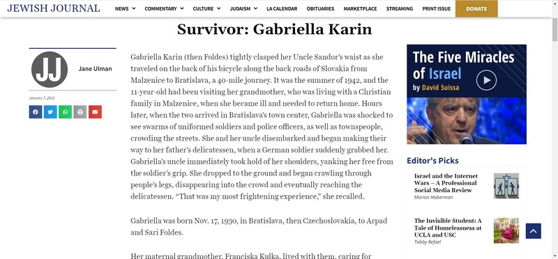 Surviving the Holocaust in Slovakia; living in hiding; mother’s work in the resistance. Regularly traveling across Europe and the Middle East teaching about the Holocaust and art; canceling such educational trips during the pandemic. The war in Ukraine impeding Holocaust educational travel. Last educational travel to Krakow in January 2020; transitioning Holocaust awareness online. As Holocaust educational travel opened up later in the pandemic for students, survivors are still not able to travel with them due to the risks of COVID among seniors. Americans comparing the current American government and the historic German Nazi Party. Occupying one’s mind during isolation: during WWII reading while hiding; during COVID-19 pandemic writing a book and making sculpture art. Learning new technologies. Searching for loved ones; remembering loved lost ones; honoring the dead. Lessons from history, nothing lasts forever: wars end, pandemics end. Gratitude to scientists working to protect us; listening to scientists. Living alone and going without the touch of loved ones; touching clay. Going for walks with friends. Community members in LA bringing care packages of food and flowers during the pandemic; kindness happens when we have enough time; young people looking to help. Difficulty accessing vaccination, repeatedly trying to get the first shot, traveling 30 minutes and standing in line; vaccine sites being closed without notice. Minor vaccine reactions. Needing medical attention due to an injury in 2022; hospital COVID safety precaution. Traveling again for the first time in April 2022 to see family. Greatgrandchild catching COVID at a nursery. The importance of memory and testimony about global injustices. Universal respect for all persons; teaching respect in the home and in school. Maintaining optimism.