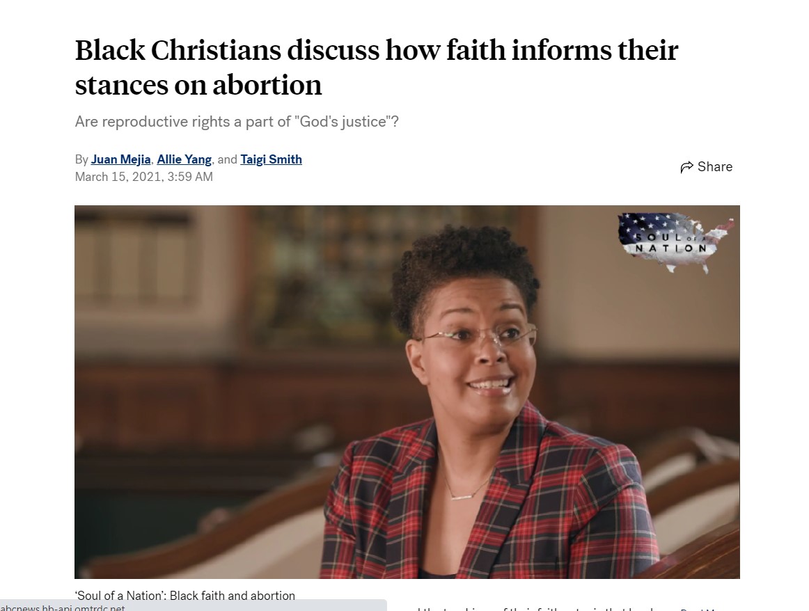 I'm trying to think of one in person. Create people are nutso on line you know, I think for people, when people know me, like people in person or people know me, they're a lot different. Right? So they're not as like, aggressive. But I cant think of a time recently. And maybe just because my brain won't let me go too far back, my brain is ike, why are you trying to do that? So I was on ABC National News, ABC did a special called soul of the nation in 2021, where they wanted to focus on the black experience in America. And they aired six episodes over the course of six weeks. And I was asked to be on the faith episode that also included the your biblical standpoint on abortion. And so I flew to St. Louis, and did you know, these interviews that were phenomenal. And I think that they were phenomenal. I'm doing this interview with, like, Debra Roberts. And they're phenomenal. Because after the interview, there's all these associate producers that are talking to me, and they're like, wow, like, I never thought about it like that, like I you know, you don't really hear that. When they aired it. They also do they always do like a written piece. Anytime they air something they do like a written piece with like a video clip. And I didn't tell people, I was gonna be on it. Like, I just was like, you know what, Lord, this came out of the blue and You tell people what you want to tell people. But this isn't I never wanted it to be an extra, you know, to attribute it to something I had done, right, like, Look at, look what I did, like, that's not how it happened. Like it was the most it was so strange how it happened, that there's no way that I could even take any credit. And I wanted to leave it at that. But a year later, because of everything that happened since you know, I really felt that I needed to thank the people that, you know, encouraged me, you know, ran alongside me and said, don't quit, like, please don't go to Starbucks and you know, be a barista, like, please keep doing this is my dream job, by the way. And, you know, I just said, you know, thank you. And so I'm tagging people in this, you know, post. And someone I'm not even friends with, who is heavily involved in the pro life movement. And hes a white male, like, literally came on to my post attacking me. Because when they asked that when she asked, do I think abortion should be illegal? My response was, I think abortion should be unnecessary. Now that it was like the phrase heard around the world, that was the the thing that got people who normally wouldn't even like because my, you know, I run an opposition, it's called pro black pro life would have dismissed me because the pro life part because of that phrase, they didn't. And so I was able to reach, you know, women in my community, because of the way, you know, I phrased that answer, which was, how I truly felt, you know, I don't think anything of it at the time, I said what I felt, but I basically wasn't pro life enough. And then I had missed an opportunity to say, on national TV that, you know, abortion should be illegal. Well, that wasn't what God doesn't call me to take opportunities to say, you know, what I want to say, God calls me into rooms to say what He tells me to say. And so, I mean, it was people, my friends were coming on and defending me. And he I seen the first posts, and I he'd written on this rant, I said, are you done? And he said, No, I'll never be done, you know, fighting this, this whole life narrative. And I said, okay, well take it up with Jesus. And that's all I said. Because at that point, like you want to fight. I'm not one I'm not going to argue with you on social media. I'm not going to spend my time typing in words to some to what you clearly don't want to hear. But I remember people calling me and saying, you the way you handled that. I couldn't and again, unless it was taken up with Jesus like I you know, I'm not going to say there's nothing like no matter what I said he's just going to come back saying like things that didn't even address what I said. And they were like, you were just I don't know how you just didn't rip into him. I don't like because there were people now that had board members coming on in responding very kindly very gracefully, but with 100% truth. But what I noticed, which was really, really strange was that he would respond to the white females and the black males. But when the other black females would come on and say something, he wouldn't respond to them at all. He would just essentially just pretend like they didn't say anything. I had friends on my on that post, who were staunchly pro choice that came on, and we're just like, I really appreciate what you're doing. Like, I'm so proud of you. So what is the point of a movement? Right? Like if you cannot reach people on the other side and not from for conversion, right? For a moment of Hmm. I never thought about that. That way. That's interesting, or even so much to say, I love you so much, even though we disagree on this issue, that I can see the passion that you have for it, that it has to you have to be called by God to do this. I appreciate everything you're doing. I appreciate you saying yes, every single day. Because if you got to do with things like this, you know, like, and you keep going, like, I don't know if I could do that.