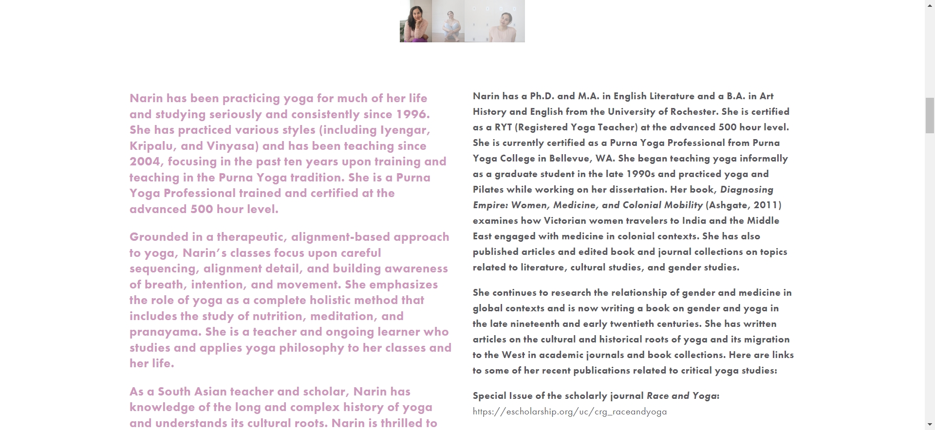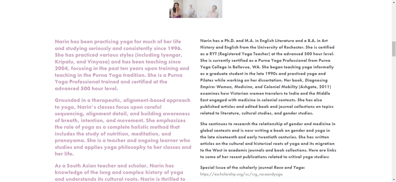 Yes, so I think it shapes my teaching, both in terms of my yoga teaching, and my academic teaching. So one of the things I guess I'll start with the academic teaching, one of the things I think, being trained in these practices for so many years has done for me is, first of all, a recognition of yourself in space, like, how are you presenting yourself, right, in a teaching environment or in any sort of setting, and how that really no matters, right in how a space is sort of set up? How you navigate the different people in that space? So, it's the self awareness, that sort of that, to me, it sort of begins with and then it's the sort of ability to read a room in multiple ways, right? So body language, who is interacting with who, who's speaking and when, like, what are they saying, what are they not saying? So, think practices, when you're trained in these embodiment practices, you sort of learn how to do that, right. And to me, that really helps thinking about, you know, the situations, my students may be in why someone may speak on a certain day, or not just being more sensitive and aware, right to those kinds of things. It's also impacted my academic teaching, because it used to be that students didn't know I was a yoga teacher. But these days, you can look these things up, right? And so in recent years, more and more students have actually asked me to bring that into the classroom, I sort of resisted that at first, because I didn't want students to feel uncomfortable, right, that their professor was like, let's take a moment to take a deep breath, ya know? Not everyone feels comfortable in a public or classroom space, sort of thinking about their body or thinking about how they're feeling. And so that was something I didn't really do. But in recent years, more and more students have said, can we actually do something at the beginning of classes, sometimes it's really simple. Like, before we start the class, let's take a moment to be grounded, like, let's think about where we are, you know, let's take a few breaths. sometimes it's been a little bit more like I had a class recently, where I had students who actually asked me to do a short minute, like, what would it be like to do a meditation before a class like just for five minutes, you know? Or what would it be like to just take a moment, to be in our bodies and recognize how we're feeling and unwind a little bit, you know, before the class and so that started to happen more and more in academic settings. I think that this generation of students has kind of grown up with that a little bit more, but also, these conversations about trauma or about, you know, stress and how it's held in the body have become more available to people, right. So there's kind of both a need and an urge, you know, from students that I'm seeing in that direction, and I think we all need these practices. Now. I don't I don't know how people survive without them, especially this one. wouldn't. So that's kind of how I see it sort of impacting the academic spaces. And then within yoga spaces, people who come to yoga classes are usually already pretty aware of how these practices help them. And the more comfortable they become with the practices, I think the more the more they recognize the value of them, but also become more open about what's happening in their bodies, how they're feeling, you know, so I think yoga spaces can be these spaces, where spaces of openness, right where people actually can talk a little bit more about how they're feeling on that day and recognize that that's just everything with you. And it's like, it's a process, right? Whether it's a process of the practice or a process of how you're feeling yourself, and how you're navigating that there's a sort of natural inclination in a yoga class, because it asks people to become quiet right to sometimes confront things that are difficult. And so that's where I think a trained teacher knows that the things you teach, and you don't teach, right, when you when you recognize the power of the process of the practice, then you kind of learn how it can be healing, but you also learn what students need and don't need, right a little bit more. So my classes tend to be pretty small, like, I'm very, I'm not at, like 30 people in a room, I tend to have students who last for a while, and who, whose bodies I sort of know and understand. And there's just things you're taught, like, if a student's study is suffering from depression, you don't have them do more forward bending, like there's just an internalization that happens there, they need back that they need things that open them up, right. So a trained teacher kind of has that knowledge, right, that comes from a deep learning about, you know, what parts of the body might hold certain emotions, or what parts of the body, you know, tend to be impacted by certain situations. And you, you integrate that in to the way that you teach or the way that you address particular student needs.