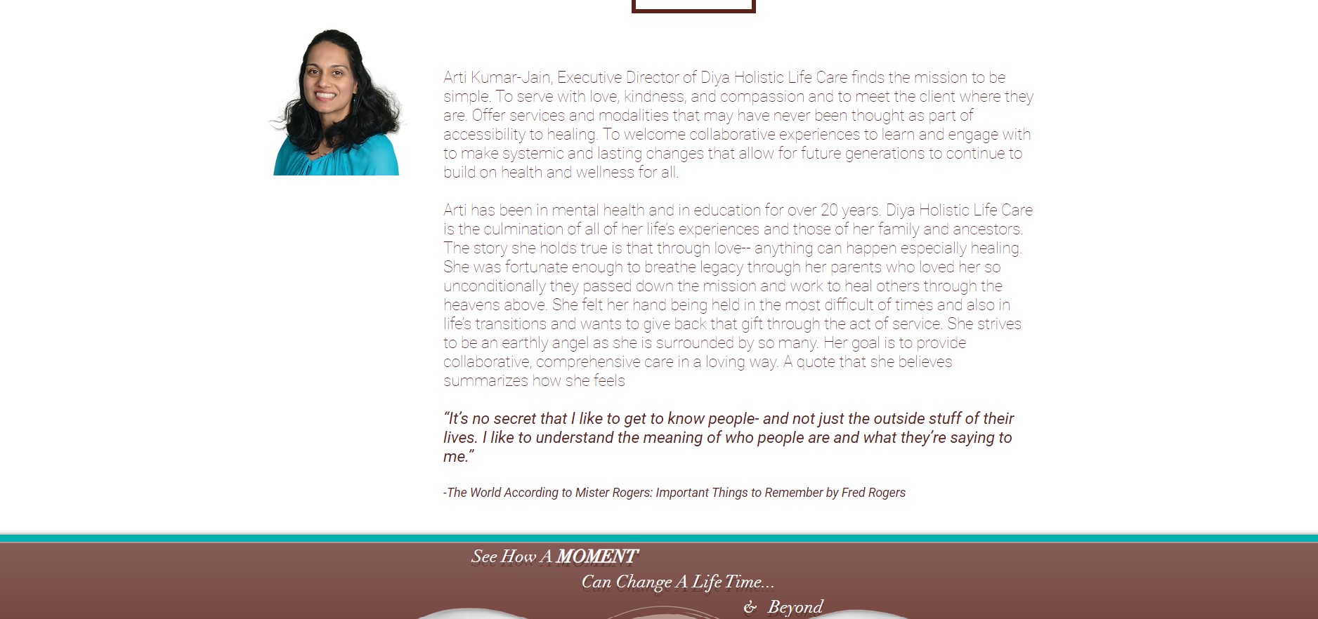 Sure, my name is Arti Kumar-Jain and I'm the Executive Director of Diya Holistic Life Care, which is a nonprofit organization.