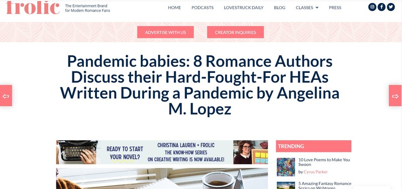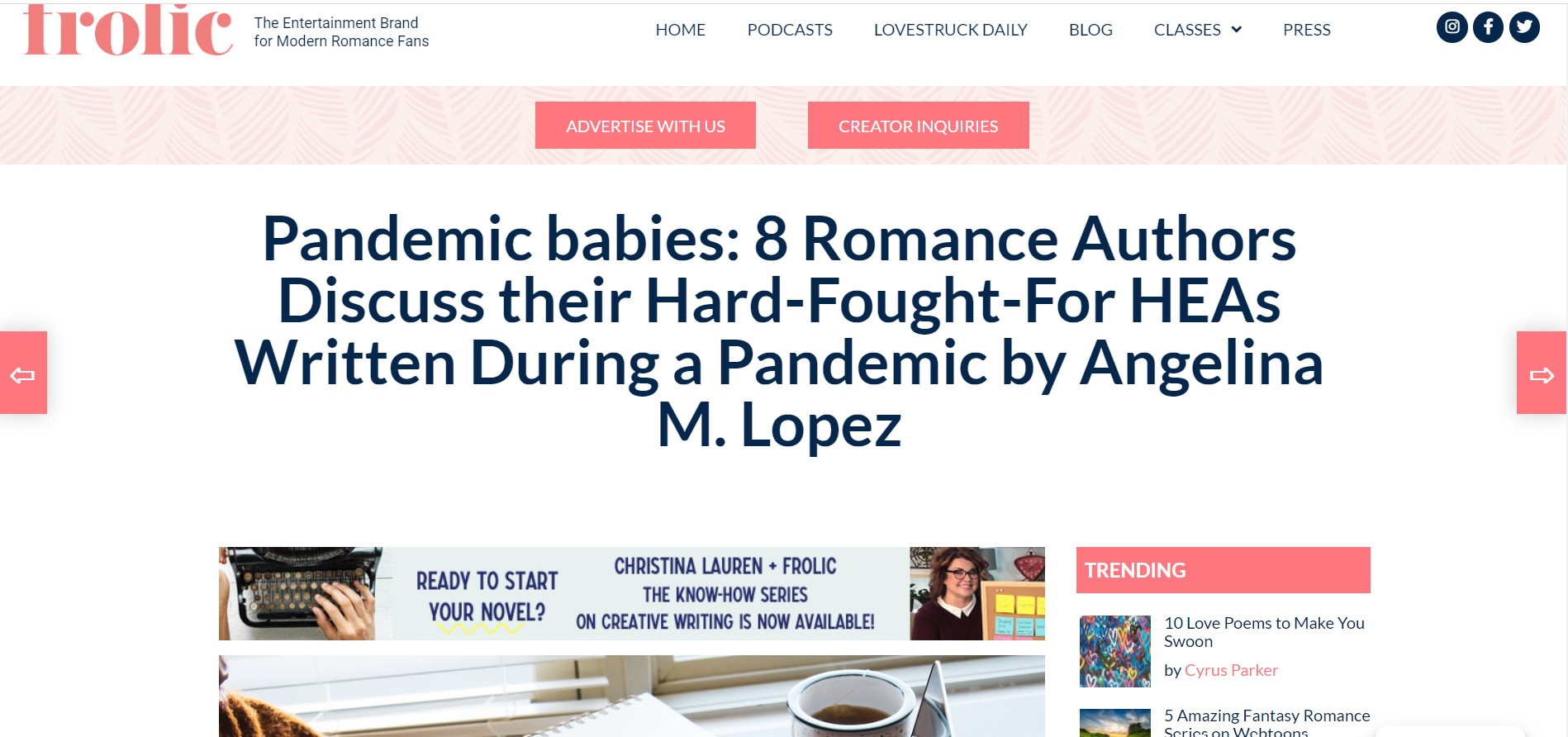 So I am by nature, a lot of authors are innate introverts, we are observers, who keep to ourselves. And when I say that I'm an introvert. People laugh because I can talk and I enjoy talking your point when I talk, but what I find is I can go and I love my husband and I were that obnoxious? Foodie, for lack of a better term, we love going to restaurants, we'd like to sit at the bar and talk to the bartenders about the ingredients you're using. I mean, we're just we're obnoxious, like obnoxious. So I like being out in the world. And I like input. You know, I like to see new things and I like to talk to people. But if I go to an event, if I if I go to whether it's hanging out with friends, or whether it's, you know, an event with people or especially a reader event, I'll do that and then I don't want to do anything else for the next four days. I don't even if like a week like my husband, I like being out but we'll do one event a weekend. And then that's it. Like we don't want to do anything else and sometimes those weekends where we don't have anything fun And that's delicious. Like we love it. So I'm, I am a person who really enjoys sitting at my desk by myself for eight hours. And talking to the characters in my head, you know, I really, it's something the writing process I fall into effortlessly. Not that writing is easy, but I follow the process of it. It really does. The worries of my day, just and part of its training. You know, I'm a very disciplined writer, I write every day, the same time, but the world falls away. And so, for me, the writing during the pandemic was an end, the isolation of the pandemic wasn't difficult. I have a I'm my husband and I will celebrate our 25 year wedding anniversary next year. Yeah, and and we innately enjoy each other's company like we just he just, I find him wildly entertaining still, weirdly, but I find him very entertaining. And then our son is just this really fascinating, funny kind of smart person. And so in terms of like, the roommate, for my husband and I, he was a perfect roommate. We moved during we moved July of 2020. So just you know, locked down and just began, we moved to a three story Townhome. So my office is on in the guest bedroom on the third floor, my husband's office is in this we have this massive living space and the first floor, he's created a an office out of the corner. So his office is on the second floor, and my son and his schooling was on his level on the first floor. And so we you know, our interaction during the day is very limited. We hardly talk to each other, we don't see each other a whole lot because we don't want to, we all go to our corners, or when you know during pandemic new good our corners, get our work done. And then we would break at like six 530 sometimes six. We were in Houston so it was this beautiful weather like it was actually an okay summer. It wasn't a horrible summer. So we break, we would have cocktails, we have a deck we'd sit out and have have our excuse me a patio, we'd have cocktails, or we'd have them inside. We have a long dinner together. We'd sit around hour and a half. Then he heard someone go do his work. And we'd go watch TV. And it was a lovely we go take walks around the neighborhood. And we live in a gated townhome complex. And we have 12 It's up like I don't know, 24 townhomes maybe there's 12 kids who live in it. So we had moved in and we got a flyer on our door, the kids would do performances. So they would do these performances, like in the garage, and the parents would bring pizza and beater. And we'd all be outside, you know, staying like potted families away from each other, but getting to know our neighbors. It was like we were living in some ideal times I don't actually think ever existed. This idea of like the kids going outside and playing and just running around and getting to know your neighbors. It happened because of COVID. So for us, for me, I had, you know, looking at the law globally, how scary what was happening, how frustrating it was what our government was doing, how unresponsive certain you know, and you know, human beings that seemed completely read in my heart unresponsive they were being that was this large umbrella of what was happening are you know, a woman we knew died in like, April, April, maybe early May. We didn't know her well, but it was shocking and horrifying. She's younger than I was and died of COVID. And so there was this umbrella thing happening, but our day to day and again, I spent eight hours a day like writing, like people falling in love and having good sex. And so it's like it was this weird. You know, that mitigate this umbrella stress was mitigated, mitigated by the day to day love of my career and the enjoyment of my life. You know, true, like the best roommates I could have had for a situation like this. We're all in a introverts and then the joy of moving to a place we moved to Houston for our choice. We weren't we we just were done with the East Coast and Donald where we lived, done racing, you know, done with high schools and so we moved inside the loop we walk there's cocktails and you know, like cocktail places in Taunton, restaurants and coffee shops. I mean like little like roll out of my house in the there. Everything we wanted out of moving was present even though we couldn't access it completely during code but chose not to access a completely made these great neighbors super welcoming the the community and the friendship we were looking for was here. So, you know, my day to day was this lovely thing happening. And it's lovely like the relationship I built with my son and my husband was like a great one, it was this lovely affirmation of this thing that I hoped was happening in my life. You know, I'm doing what I want with my career, I have this great relationship, my husband, my son, we all enjoy each other's company like adults, there was this lovely affirmation of this thing happening during a global pandemic. So that