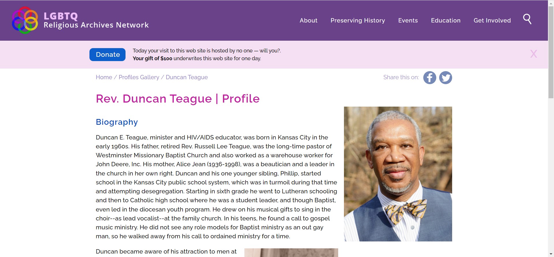 More on Rev. Duncan Teague has been collected at the Auburn Avenue Research Library. Relevant collections are cataloged as the Duncan Teague collection, ADODI Muse: A Gay Negro Ensemble, and the Tony Daniels Collection (Carl Anthony Daniels). The African American AIDS History Project also has materials in the “Duncan Teague Personal Collection”.