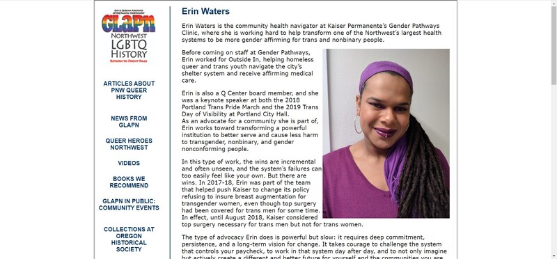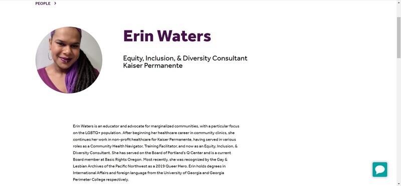 Sure. So I'm Erin she/her pronouns, black transgender woman, I'm almost 40. So I've made it past the statistics of us only making it to about 35 or so I'm gainfully employed, still have access to family and partners. So kind of breaking a bunch of the the assumptions and the narrative that is written for black transgender women at this period of time, in our history, spent many years working in community health. So I started off my healthcare career working in a free clinic that did a lot of work with folks who were active users, undocumented, seniors, focused on Medicaid, Medicare, and then a lot of the trans and gender nonconforming community as well. From there, I started working for large scale healthcare. And so I work for some larger corporate kind of nonprofits, helping build their understanding of how to provide transgender and gender affirming health care, as well as some work around general like diversity and inclusion type of stuff. And then now I currently work for a small organization support a specifically supporting trans and queer identities in the greater Portland area.