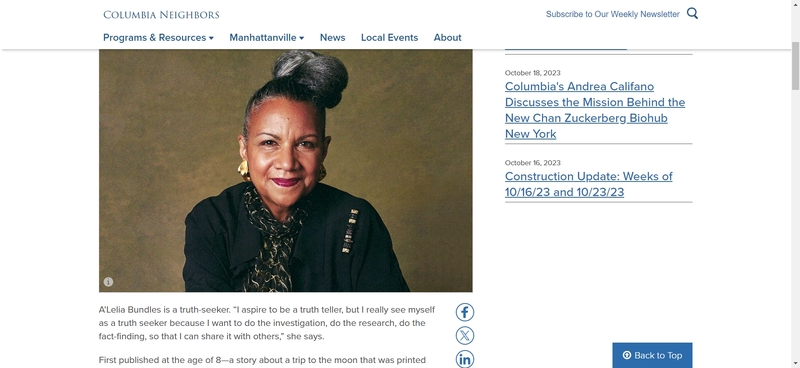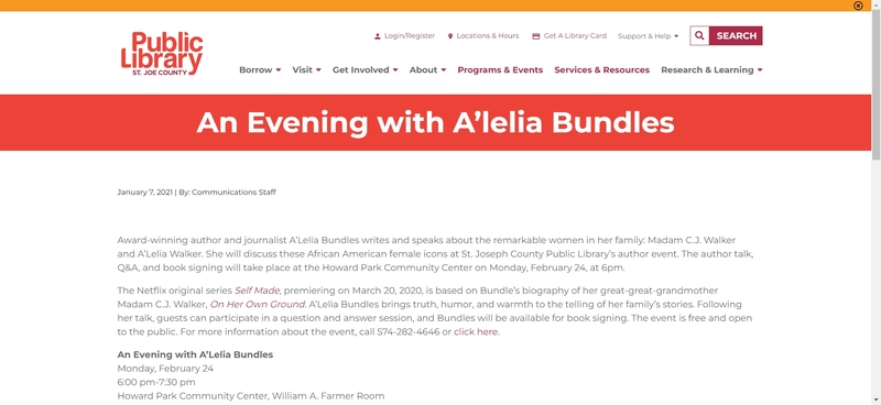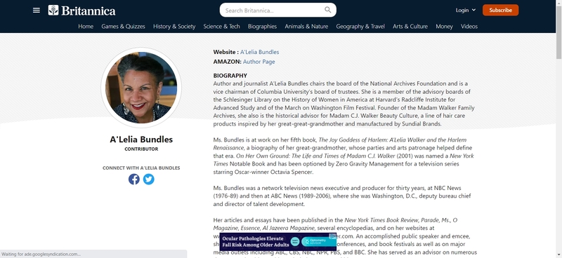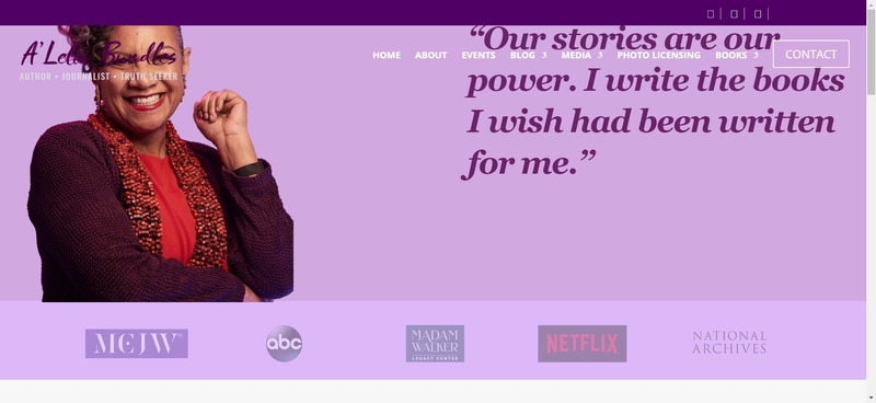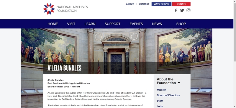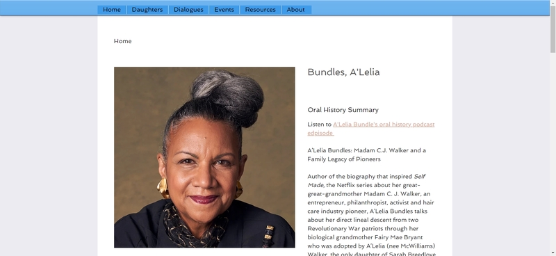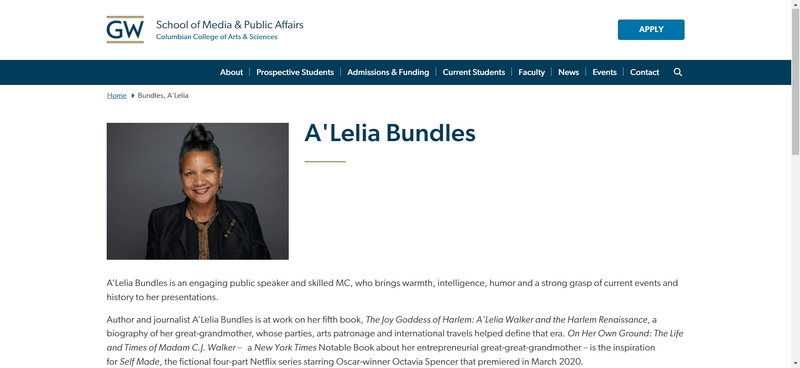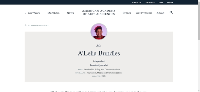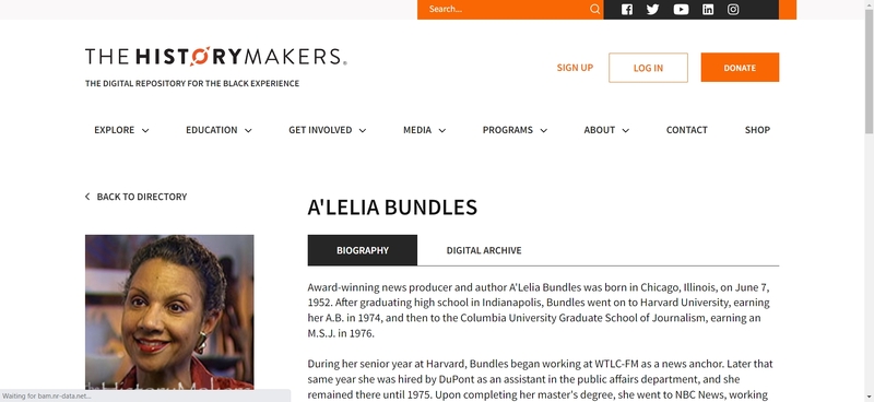 Self Description - "My name is A'Lelia Bundles and I am a journalist and author. And I have I spent many years as a producer and an executive with NBC and ABC News. I also write about the women in my family including Madame CJ Walker, the early 20th century entrepreneur and her daughter Alia Walker."