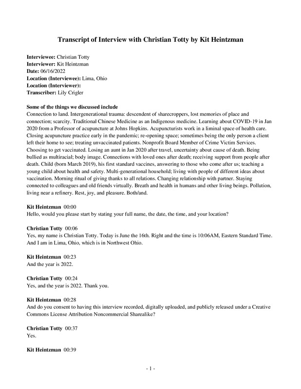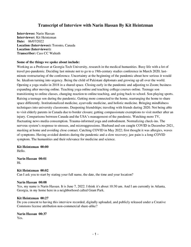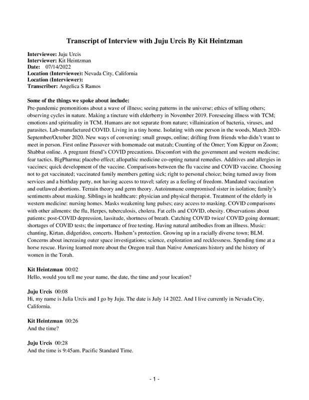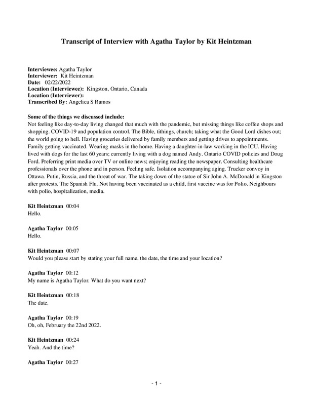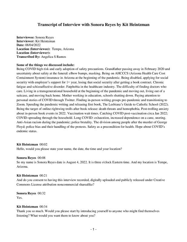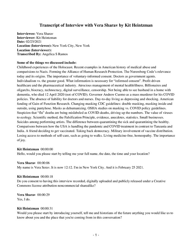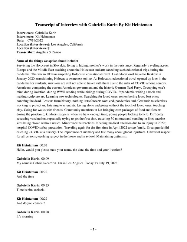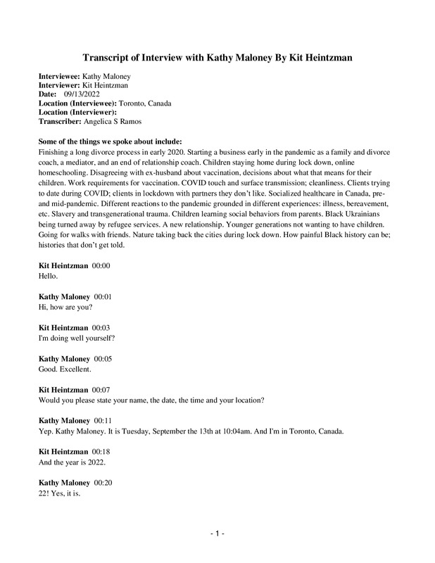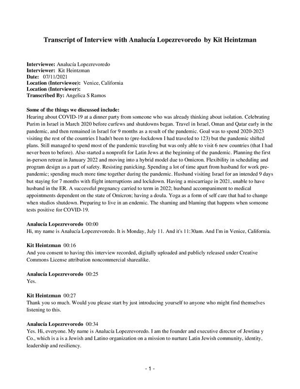 En esta entrevista Silvia Muñoz Mata es entrevistada por Carmen Kordick Coury concerniente al covid-19 en Costa Rica. Empiezan hablando de los cambios que habían ocurrido desde el ano anterior. Hablan del trabajo y el trabajo virtual. De la violencia domestica y otros problemas que existen en la sociedad. De allí hablan del crimen, violencia y las divisiones económicas que existen alrededor de ella. Hablan de las vacunas, gente conocida que no se quiere vacunarse y las teorías conspiratorias que existen sobre las vacunas. De allí hablan del gobierno, familia y salud física y mental. Para terminar hablan de narcotraficantes y del futuro.