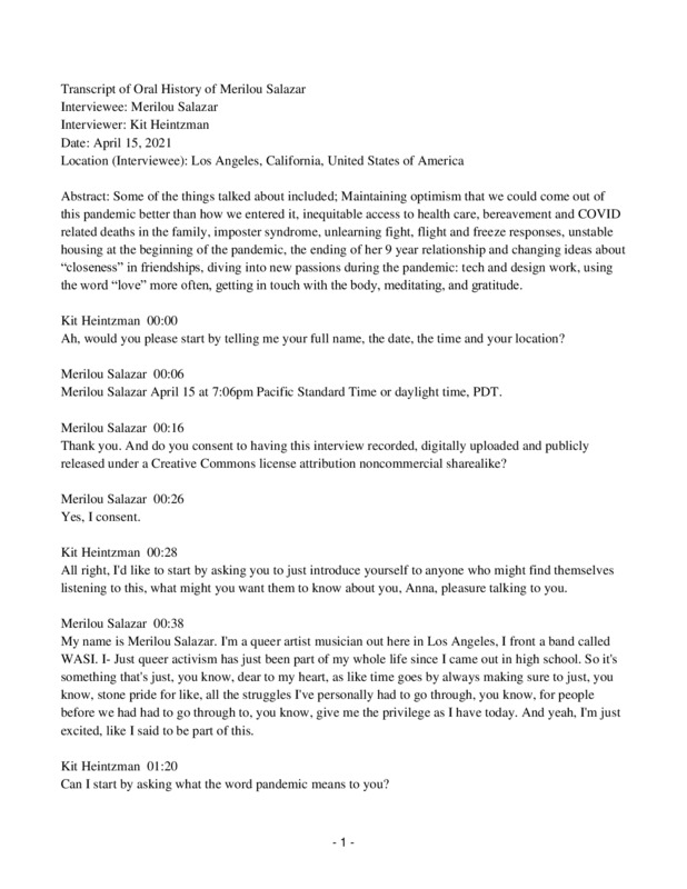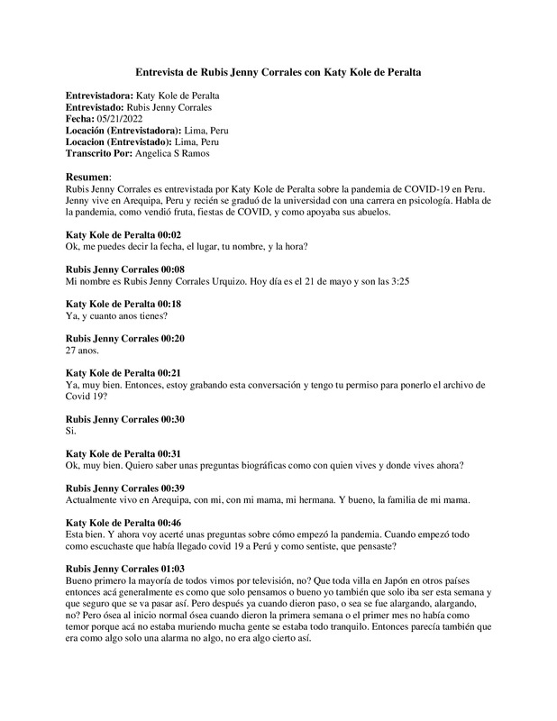 Jenny Rubis Corrales es entrevistada por Katy Kole de Peralta sobre la pandemia de COVID-19 en Peru. Jenny vive en Arequipa, Peru y recién se graduó de la universidad con una carrera en psicología. Habla de la pandemia, como vendió fruta, fiestas de COVID, y como apoyaba sus abuelos.