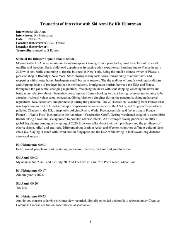 En esta entrevista Francisco Guzman Solano es entrevistado por Carmen Kordick Coury concerniente al covid-19 en Costa Rica. Empiezan hablar de los cambios que Francisco ha visto desde el ano anterior. Hablan de la economía y el gobierno, de su trabajo y la vacuna. También hablan del aumento del crimen, de las drogas, y de las noticias falsas. De la Caja y el ministro de Salud. Francisco también habla de su familia y su hogar, de las fuentes principales de información y la sociedad. Terminan hablando de las clases virtuales de su hija, de la educación y del Ministerio de Educación.