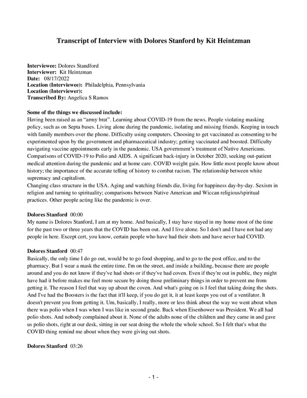 Self Description: "My name is Dolores Stanford, I am at my home. And basically, I stay have stayed in my home most of the time for the past two or three years that the COVID has been out. And I live alone. So I don't and I have not had any people in here. Except cert, you know, certain people who have had their shots and have never had COVID."