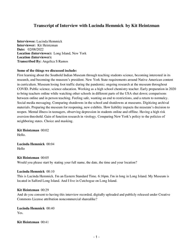 “My name is Lucinda Hemmick and I’m the President of the Southold Indian Museum, which is a chapter of the New York State Archaeological Association. The museum is owned by the chapter and it’s located in Southold New York. I am the museum President, but I am also a high school science research teacher. So I do always have an agenda and that’s going to come out in this interview.”