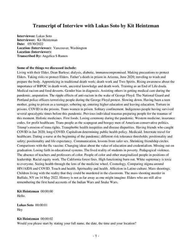 Self Description: "my name is Lukas Soto. I use they them pronouns in English and elle en Espanol, I'm a mixed race Chile Mapuche, and then Minnesota Chippewa or Ojibwe and Western European. I grew up in the Pacific Northwest, and lived in Oregon for the better part of 30 years. And I currently reside on the Pyramid Lake Paiute reservation in northwestern Nevada, where I live with my elder Dean bar lease, who had been kind of apprenticing or mentoring under when it comes to traditional death work."