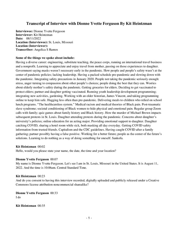 Self Description - "So I'm Dionne. I live in St. Louis, Missouri, born and raised in St. Louis, Missouri, both of my parents born and raised in St. Louis, Missouri. spent some years in Atlanta, Georgia going to college there, I went to the historically black college and university Spelman College. And I was in a dual degree program in math and engineering. And so I spent two years at Georgia Tech getting an engineer degree in civil engineering. And then I joined, let's see, no, I came home, I did some substitute teaching. And then I found a job as an engineer with our water division, St. Louis City Water division. After that, I got the bug as far as wanting to travel, which had been implanted in me with by my parents by my mother specifically. And I joined the Peace Corps, because that's something my aunt did in the early 60s, and she was my favorite aunt. And so I followed in her footsteps and became a Peace Corps volunteer. So that was the start of my international travel."