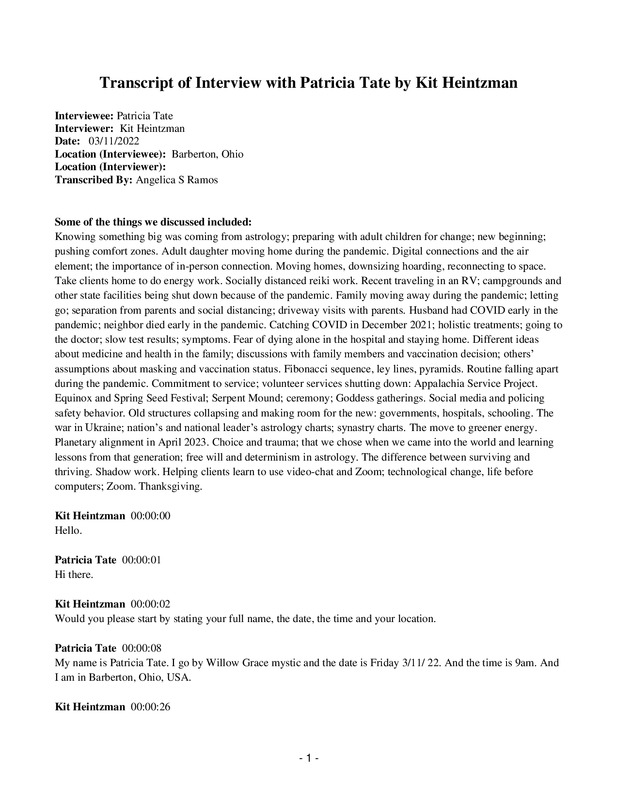 Self description: “My name is Patricia Tate. I consider myself a healer. I use astrology, tarot, I’m a Reiki Master, and I use Aka Dua, and so I’m an energy worker. And the goal is to help work with others through whatever they… or to guide them or to give them information. I receive dreams. And yeah, I don’t know what else you’d want to know about that.”