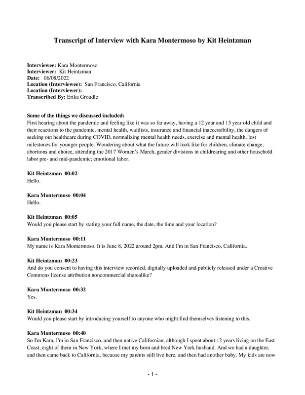 Self Description: "So I'm Kara, I'm in San Francisco, and then native Californian, although I spent about 12 years living on the East Coast, eight of them in New York, where I met my born and bred New York husband. And we had a daughter, and then came back to California, because my parents still live here, and then had another baby. My kids are now 15, and 12. So there's been a lot of life changes in the decade or so. I also worked full time. I've been working full time, since I could work. And definitely during COVID. Some interesting tidbit is I've been working remotely for the last 15 years. So all the new things that came about in COVID, with remote work were not new to me. It was very interesting to watch, a mass movement of people sort of like walk into that into that life and into that lifestyle, albeit under very different circumstances than I did. And I, what I do for a living is not really the career I fell into working sort of administrative HR, Chief of Staff sorts of things at a nonprofit is not really where I ever saw myself. I never saw myself as a career person at all. And in light of that, I do a couple of things on the side. We're in the gig economy. So you know, that's the thing and these days. So I do a lot of youth sports coaching. That's really like where my passion is. I'm a yoga instructor. I studied massage therapy. At one point, I was a massage therapist at one point. I have hopes of writing a book at some point in my life. I don't know that's about it."