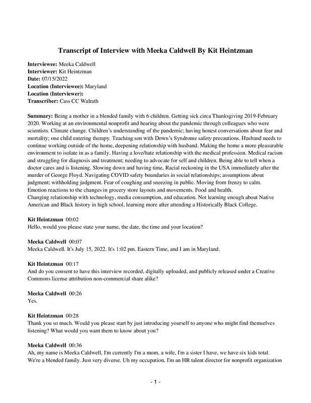 Self Description - "My name is Meeka Caldwell, I'm currently I'm a mom, a wife, I'm a sister I have, we have six kids total. We're a blended family. Just very diverse. Uh my occupation, I'm an HR talent director for nonprofit organization based in Washington, DC. And I'm also a children's book author. I actually specialize in writing children's books for those communities that are unheard. So, my son who was eight years old, has Down syndrome. And he is a wonderful black child. And I noticed that we didn't have any books that, that highlighted black children with Down syndrome, much less Down syndrome at all. So that's why I became a children's book author."