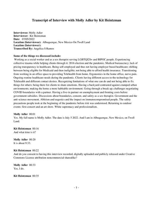 Self Description: "So my name is Molly Adler. I'm a social worker, clinical social worker, and therapist in Albuquerque, New Mexico, I am a trainer, I have a company called Sex Therapy in New Mexico. And it's a therapy, private practice focused on sex therapy, and working with LGBTQ, IA, two spirit folks, and, and do continuing ed trainings on topics related to anti oppression, therapy practices, and sexuality and gender, and relationships. And I previously co founded self serve sexuality Resource Center, foster choice, here in Albuquerque, New Mexico, in the sex ed world."