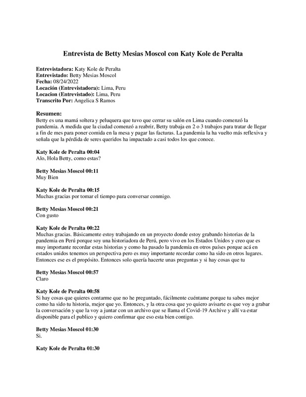 Betty es una mamá soltera y peluquera que tuvo que cerrar su salón en Lima cuando comenzó la pandemia. A medida que la ciudad comenzó a reabrir, Betty trabaja en 2 o 3 trabajos para tratar de llegar a fin de mes para poner comida en la mesa y pagar las facturas. La pandemia la ha vuelto más reflexiva y señala que la pérdida de seres queridos ha impactado a casi todos los que conoce.