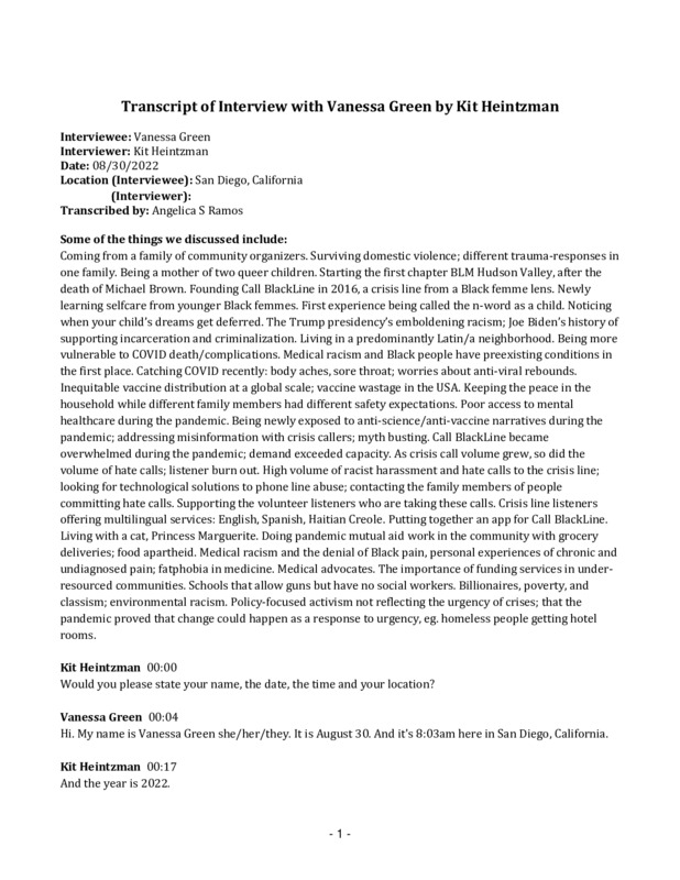 Self Description: "I'm a longtime activist, boots on the ground organizer. I'm originally from New York. I started the first BLM Hudson Valley Chapter outside of New York City. And that was when Mike Brown actually died. And I am based on going to Ferguson when Mike Brown was murdered. I started called black line, but a bunch of black femmes and Call BlackLine has been really live since 2016, but really became official in 2017. I'm a mom of two queer children. Nayisha and Haquin I came who are my, my joy, you know, my reason that I do live and do organizing work. I moved to San Diego four years ago, and was lucky to do some civic engagement with organization in San Diego, and then secured a county job recently, about a year ago when they created the newly Office of Equity and race of justice. So that is kind of in a nutshell who I am. I mean, my both my my mom was the organizer. You know, she was a I call it professional organizer and my grandmother, I think I got a lot of my spirit from my grandmother, my grandmother was a bomb, really a community organizer. So I always want to lift up those two Pearly Mae Height and my mom, Jean Grey."